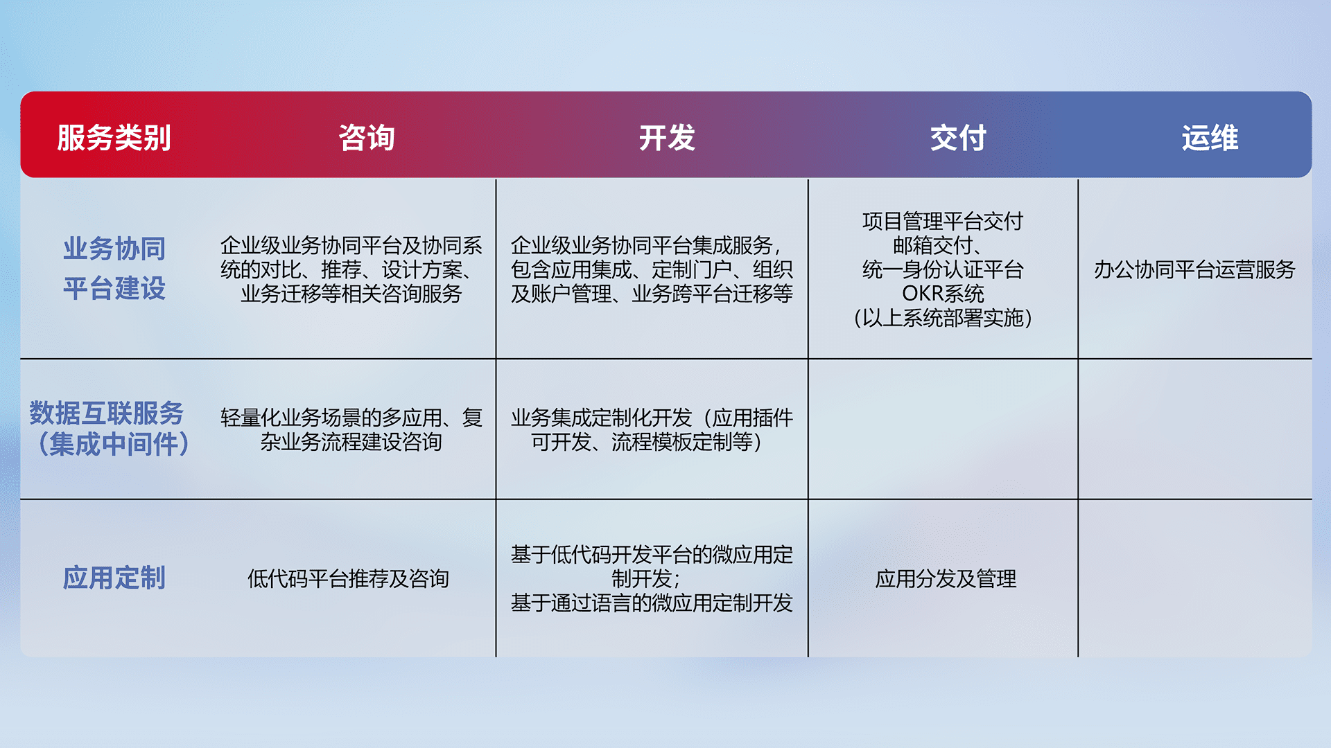 针对钉钉、、、企微、、、IDaas等平台级产品提供产品的规划、、、方案、、交付、、、、定制化开发等服务,,,实现如统一协同办公、、智能客户服务、、、混合会议管理、、、、智能数据查询、、、等业务场景,,实现数字化转型。。。